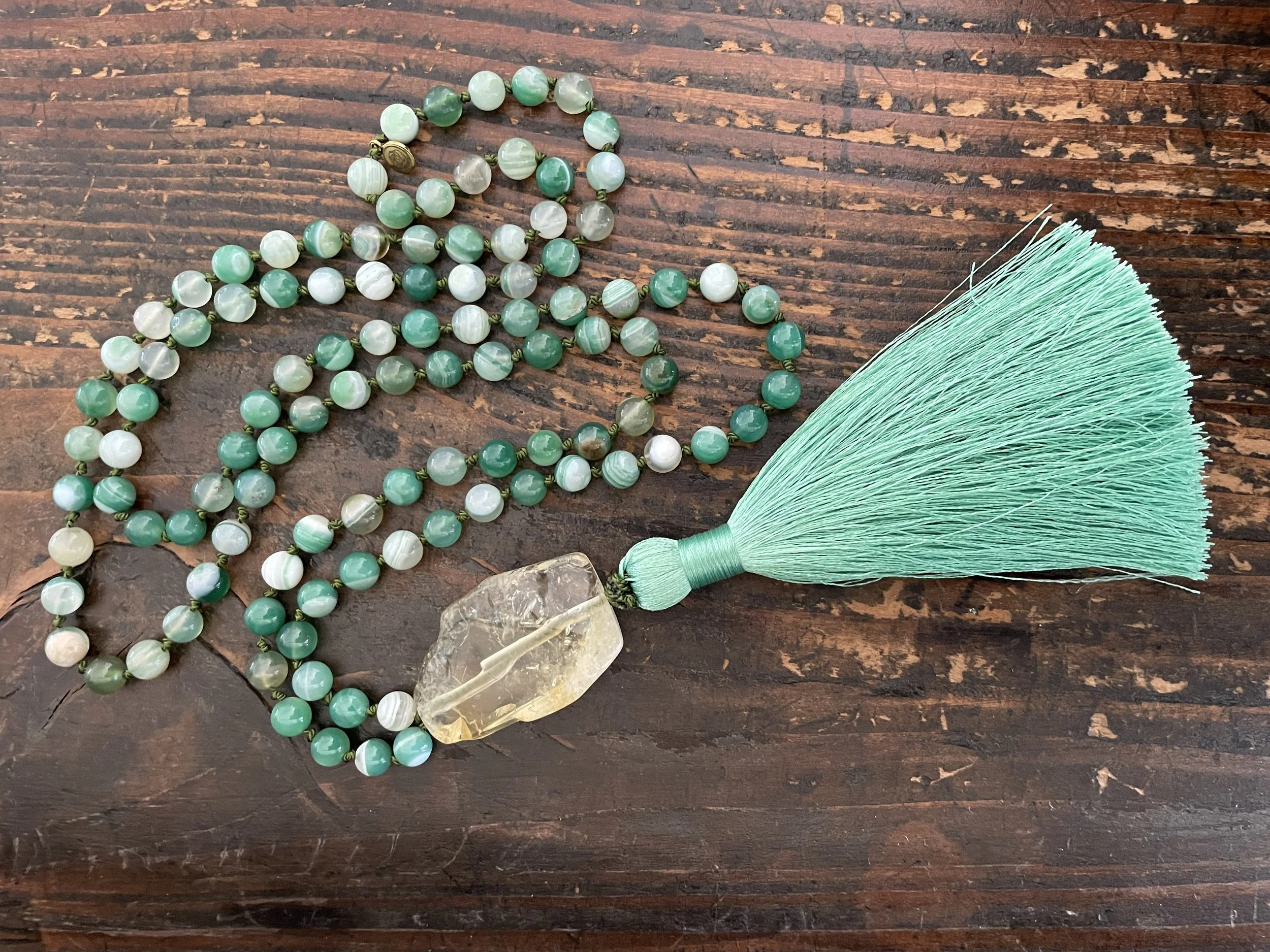 Mala Necklaces are used in ancient traditions during meditation and prayer. The Mala itself has a number of healing properties as it is infused with intention during the creation process and many people find that just holding or wearing the mala gives them a sense of peace and emotional wellbeing. The Mala can be used as a spiritual practice or simply enjoyed for the beauty and energy that resides within each stone, crystal, thread and tassel.